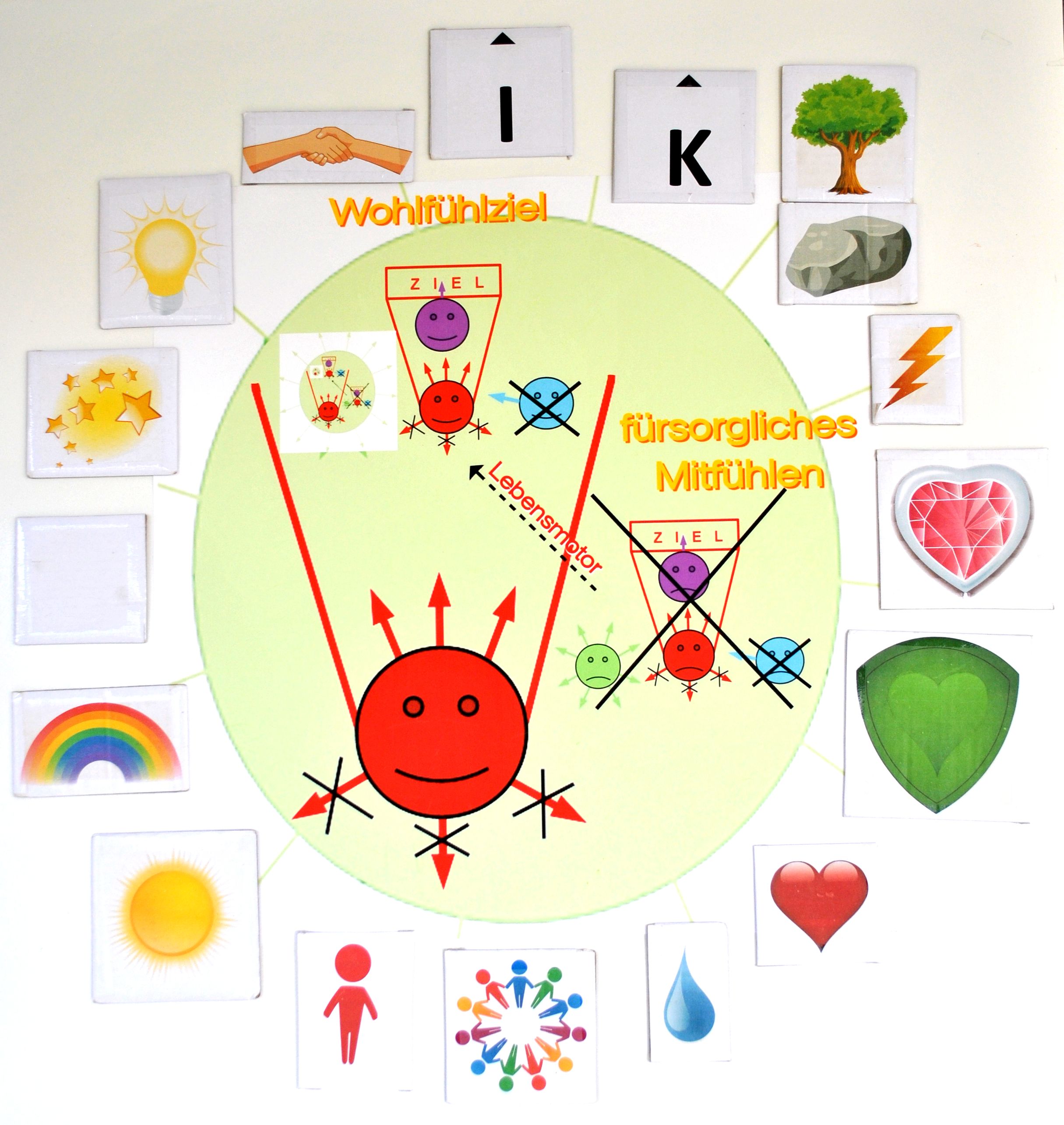 In dieser Abbildung ist mein Ziel demnach, alle vier Basis-Verhaltensmuster (Spieler (rot) = Ziele verfolgen, Mitspieler (violett) = anderen helfen, Nicht-Spieler (blau) = nicht mitmachen, Alles-Spieler (grün) = "... und auch das gehört dazu") immer mehr im gelösten möglichst schmerzfreien Zustand zu leben und zu erleben (Wohlfühlziel). Und/oder es ist mein Ziel, geschmerzte Verhaltensmuster in gelöste Verhaltensmuster zu transformieren (siehe den gestrichelten Pfeil = Lebensmotor). Dabei transformiere ich meine eigenen geschmerzten Verhaltensmuster in gelöste Verhaltensmuster - und ich stehe anderen Menschen helfend zur Verfügung, wenn sie das Ziel verfolgen, ihre geschmerzten Verhaltensmuster in gelöste Verhaltensmuster zu transformieren und dabei Unterstützung wünschen. Dies kann mit Elementen geschehen, die uns an unsere eigenen Ressourcen erinnern. Dafür steht die "Selbstheilungszelle". Die Ressourcen-Symbole, die Teil der Selbstheilungszelle sind, findest Du hier unten in der dritten Abbildung.